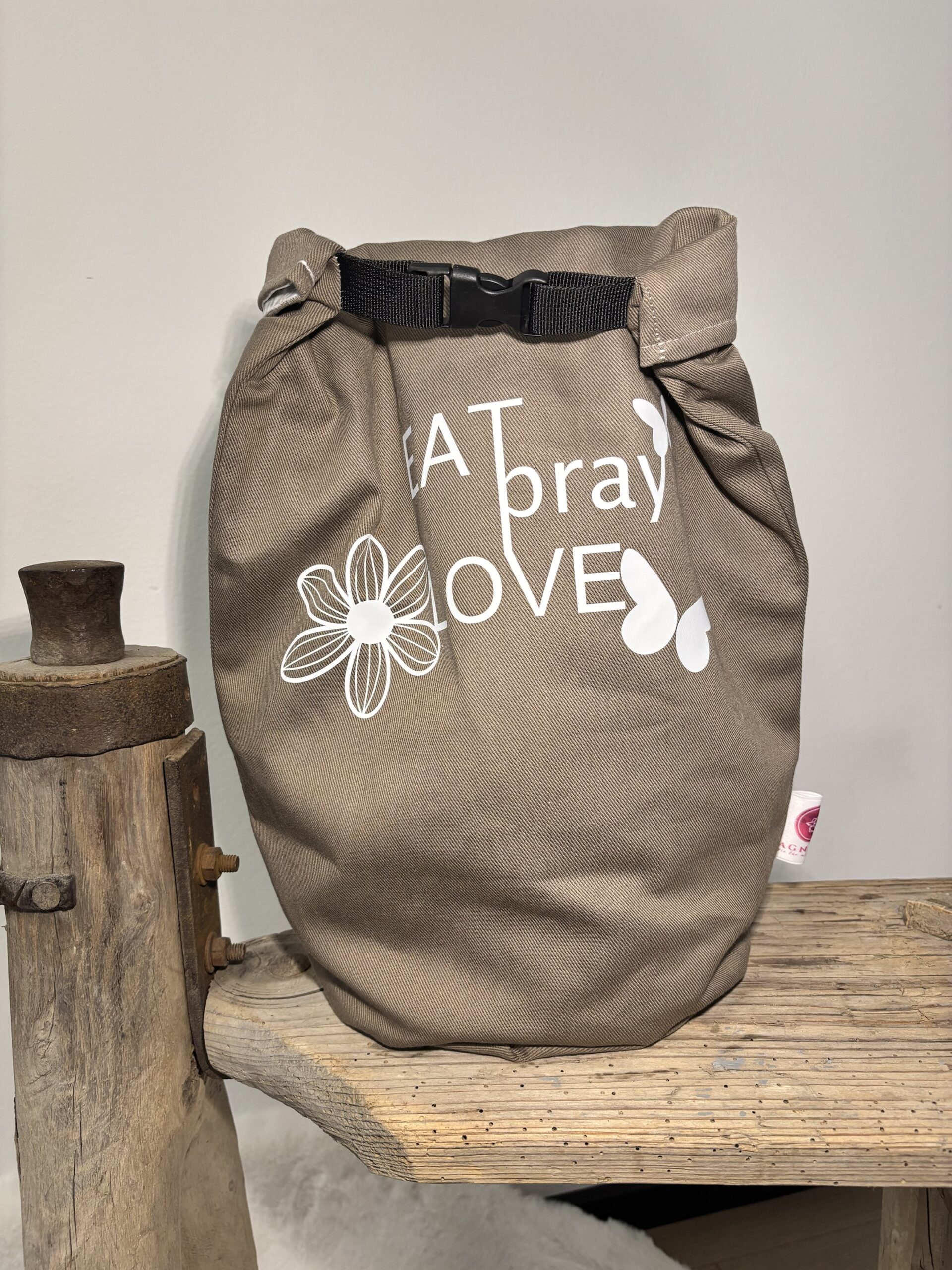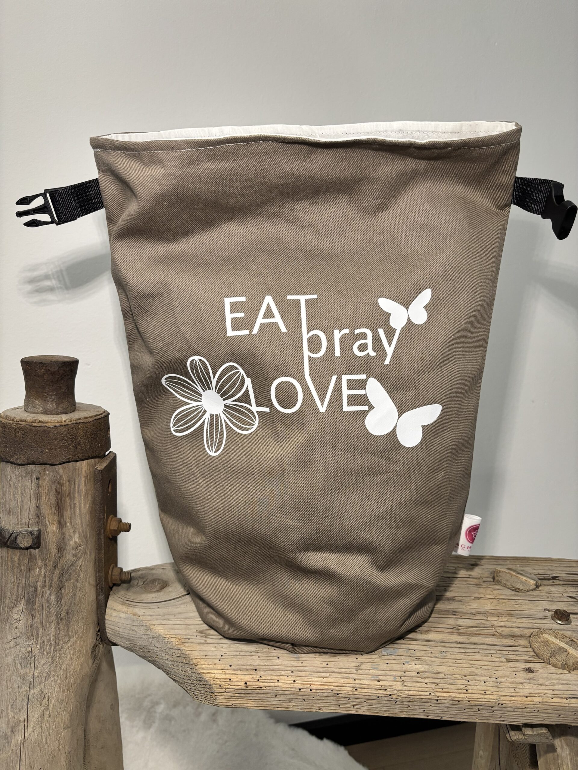 Waschbar per Hand (!) : mit warmen Wasser und Spül/Waschmittel. Zieh den Beutel dafür einfach auseinander. An der Luft trocknen lassen. Bügeln nur auf dem Baumwollstoff und NICHT direkt auf dem Designdruck (Du kannst aber auf den Designdruck Backpapier legen)