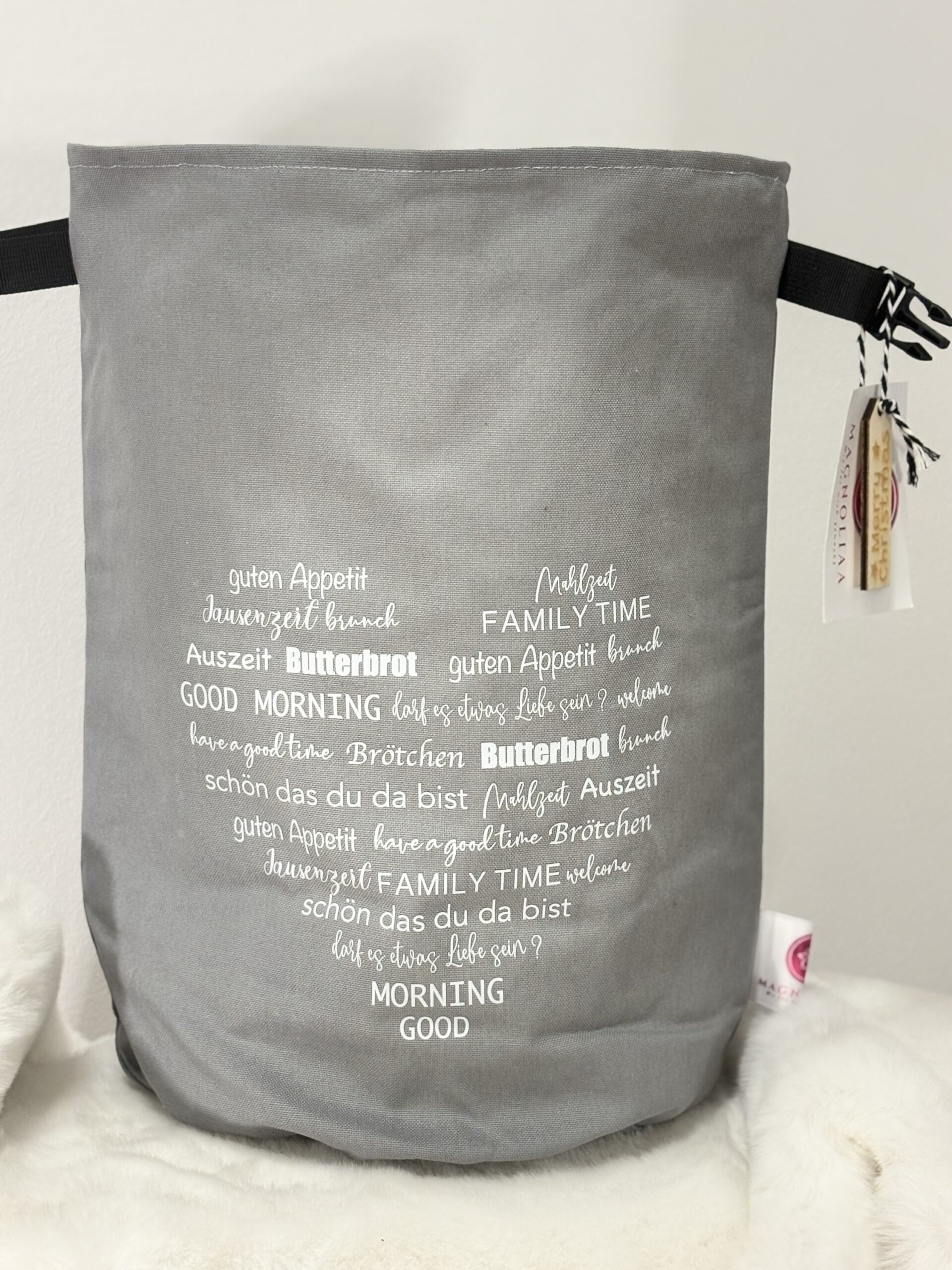 Waschbar per Hand (!) : mit warmen Wasser und Spül/Waschmittel. Zieh den Beutel dafür einfach auseinander. An der Luft trocknen lassen. Bügeln nur auf dem Baumwollstoff und NICHT direkt auf dem Designdruck (Du kannst aber auf den Designdruck Backpapier legen)