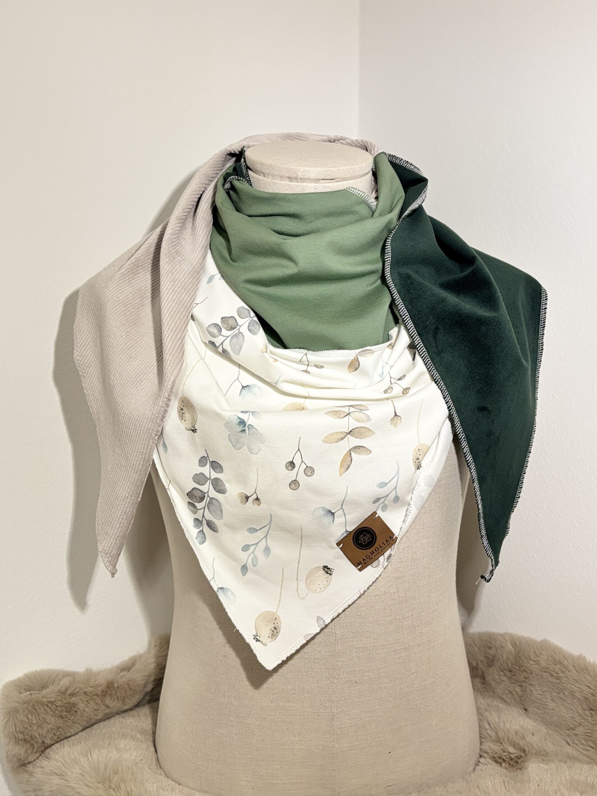 Dreieckschal mit sichtbaren Nähten. Zueinander abgestimmte Stoffe machen ihn zu etwas besonderen.
