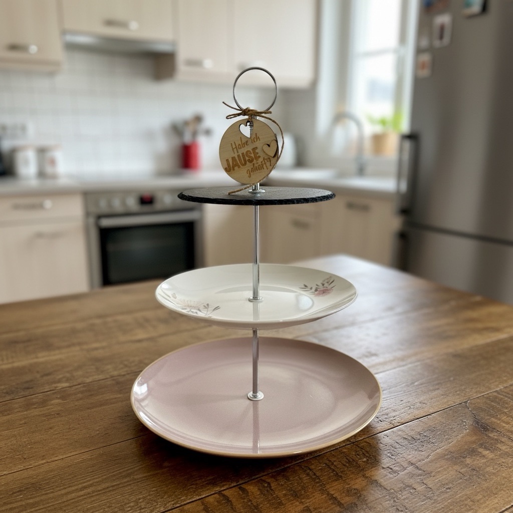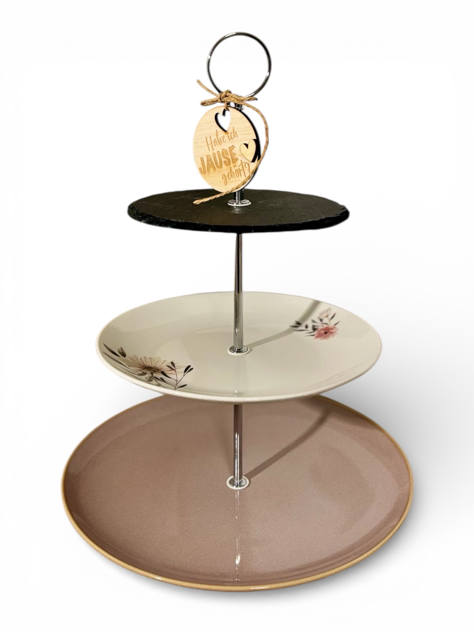 Jedes Etagere wird liebevoll mit Tellern und Platten (aus Schiefer/Holz) farblich zusammengestellt. Die Etagere Stangen sind aus Metall und je nach Variante in schwarz, gold oder silber erhältlich.
