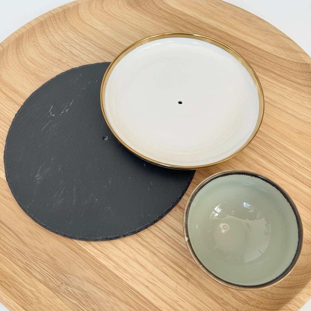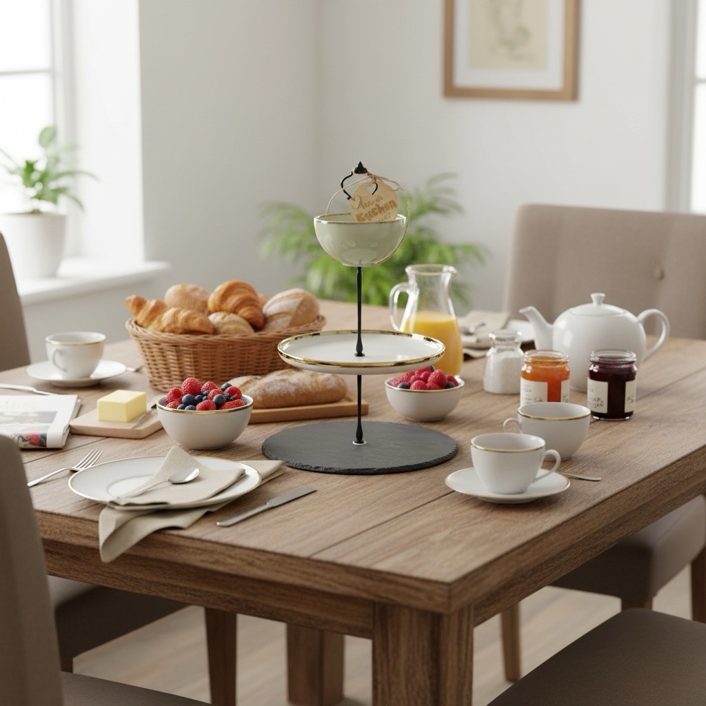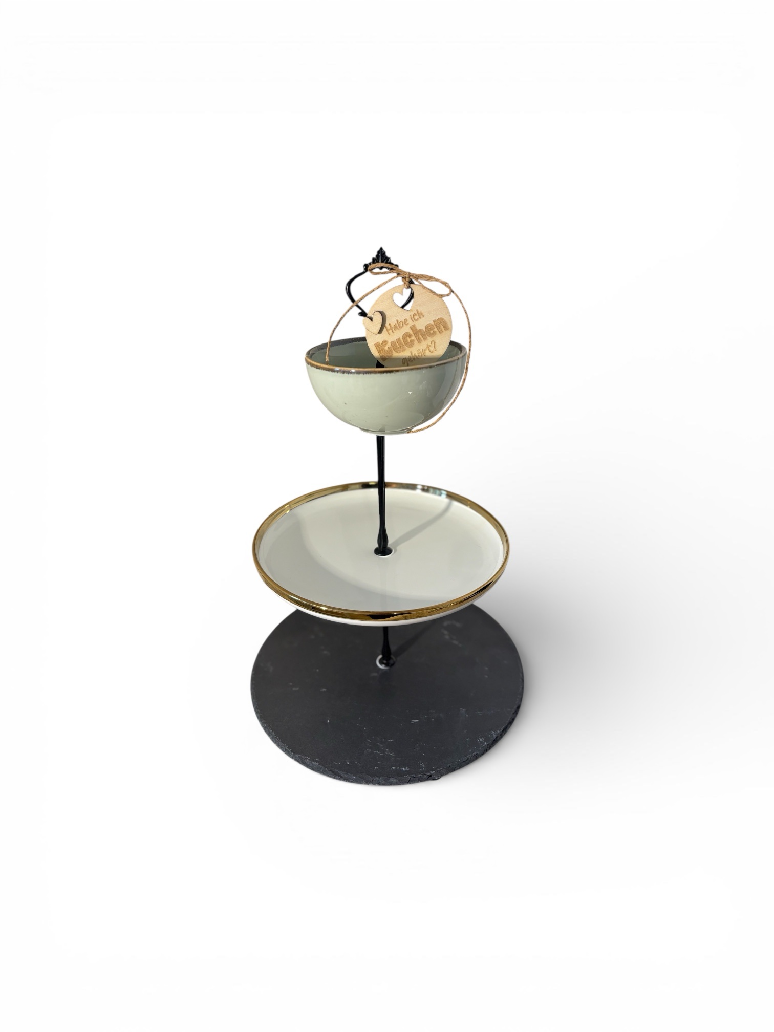Jedes Etagere wird liebevoll mit Tellern und Platten (aus Schiefer/Holz) farblich zusammengestellt. Die Etagere Stangen sind aus Metall und je nach Variante in schwarz, gold oder silber erhältlich.