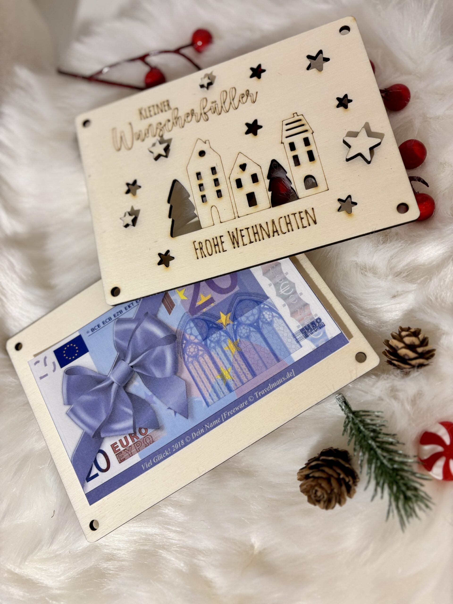 Mit dieser Holzkarte kannst du deine Scheine schön und liebevoll verpacken.