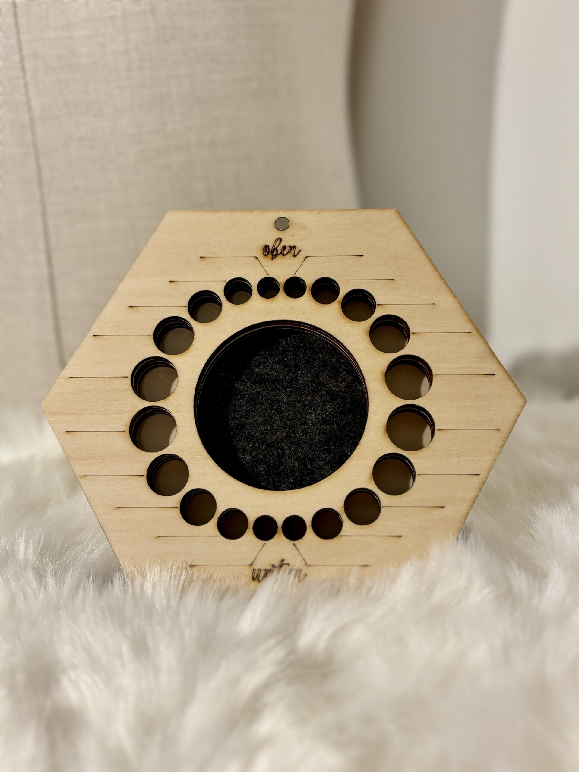 Besteht aus Holz, Acryl. Der Deckel hält durch Magnete.